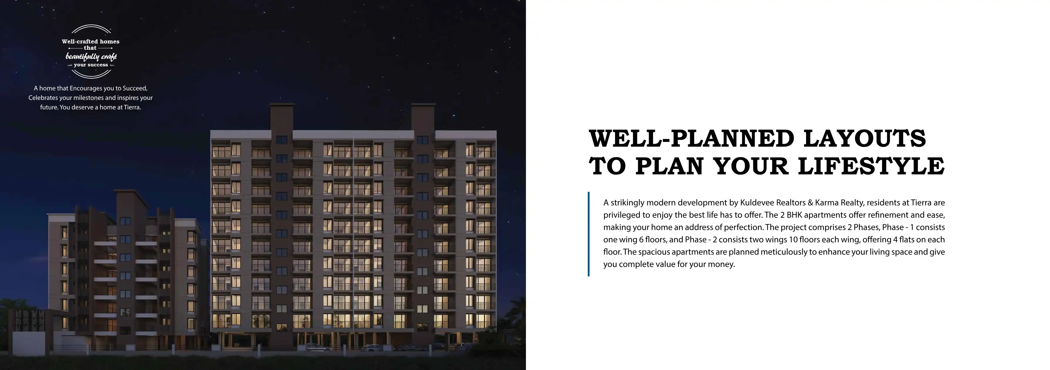 A strikingly modern development by Kuldevee Realtors & Karma Realty, residents at Tierra are privileged to enjoy the best life has to offer. The 2 BHK apartments offer refinement and ease, making your home an address of perfection. The project compri...