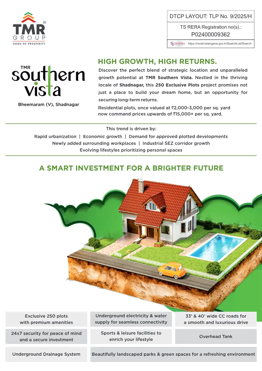 TMR Southern Vista is a 250 Exclusive Plots project promises not just a place to build your dream home, but an opportunity for securing long-term returns.