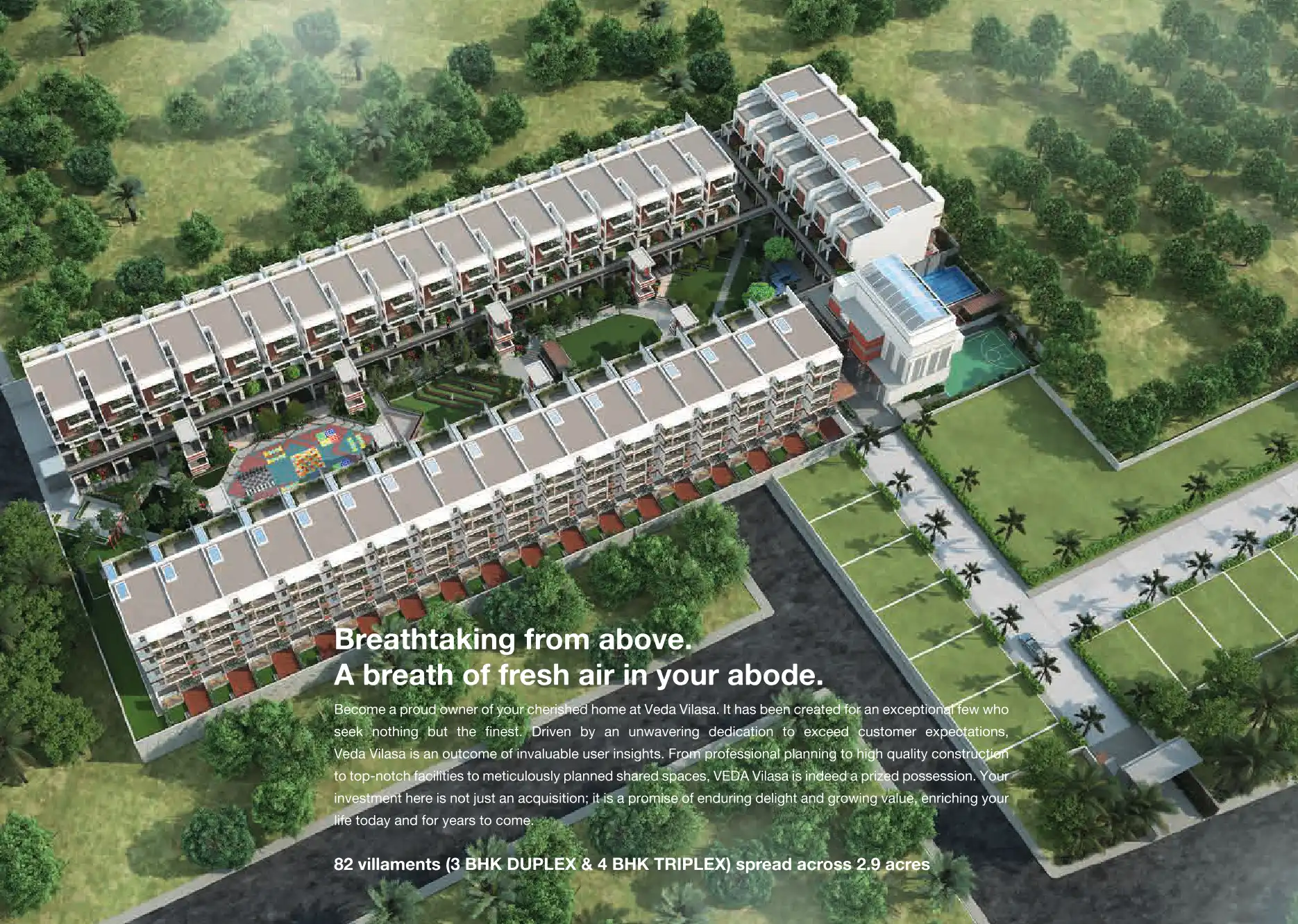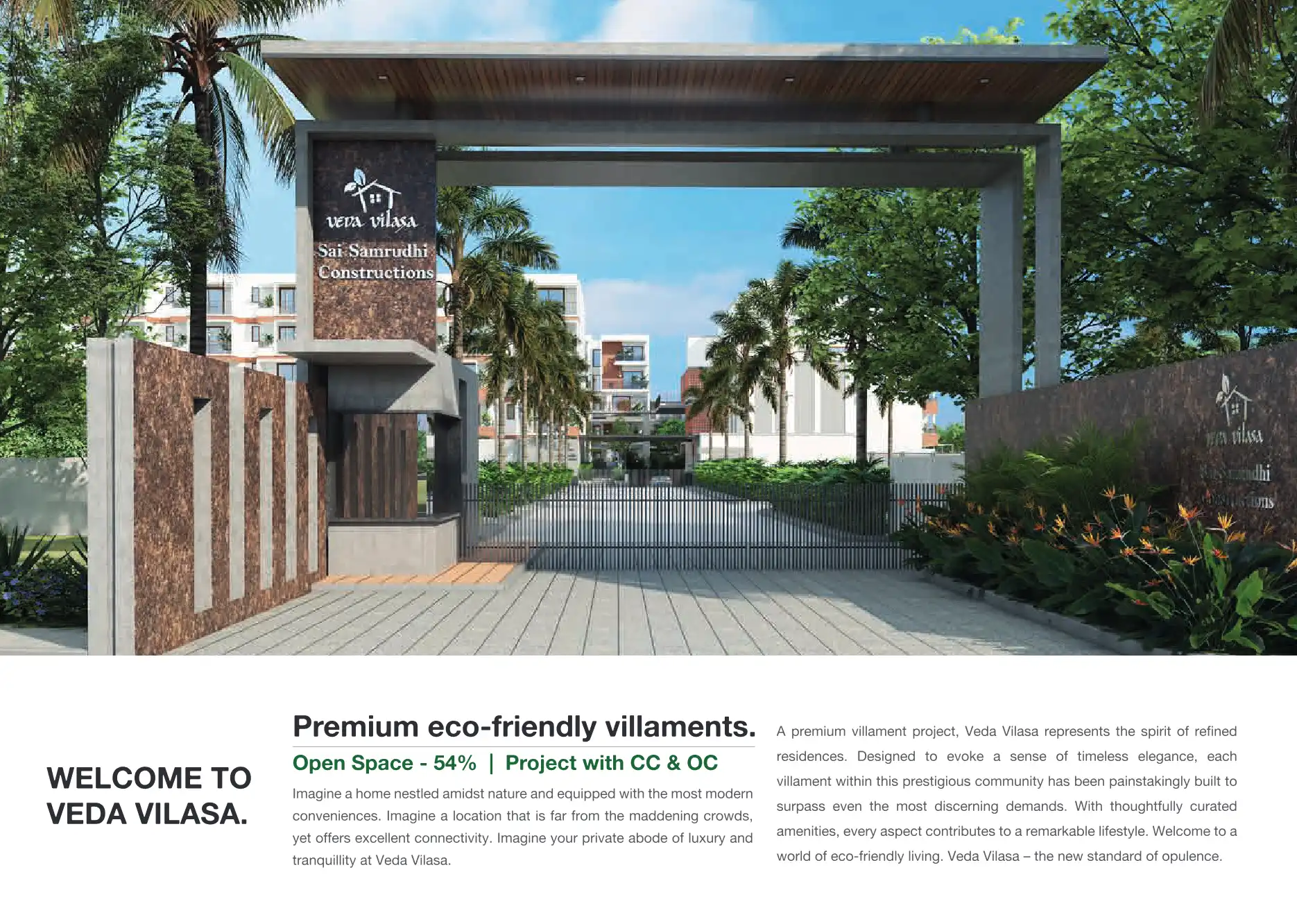Veda Vilasa is a villament project offering 3 and 4 BHK duplex and triplex homes spread across 2.9 acres. It emphasizes eco-friendly living with modern amenities and a focus on natural light and space.