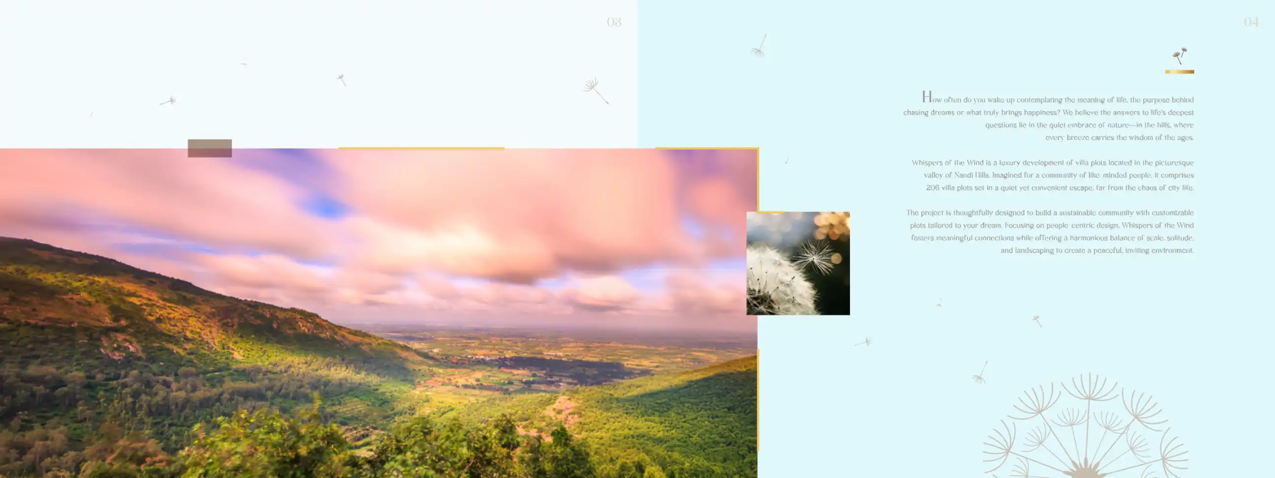 Whispers of the Wind is a luxury development of villa plots located in the picturesque valley of Nandi Ilills. Imagined for a community of like-minded people, it comprises 206 villa plots set in a quiet yet convenient escape, far from the chaos of ci...