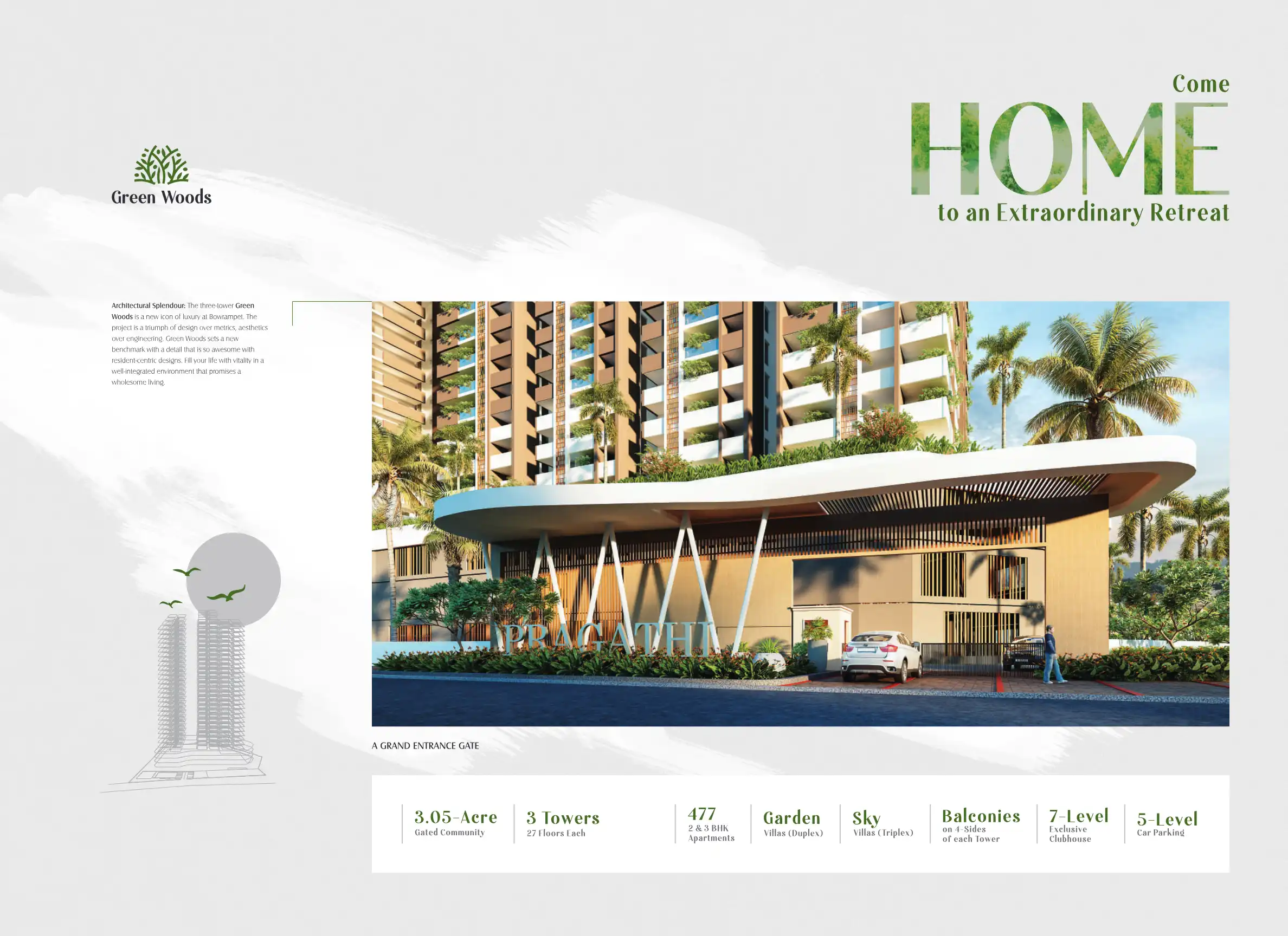 Pragathi Green Woods is an exquisite blend of design excellence and nature's exuberance. The project displays an amazing flexibility in spaces to meet the varied needs of its residents.