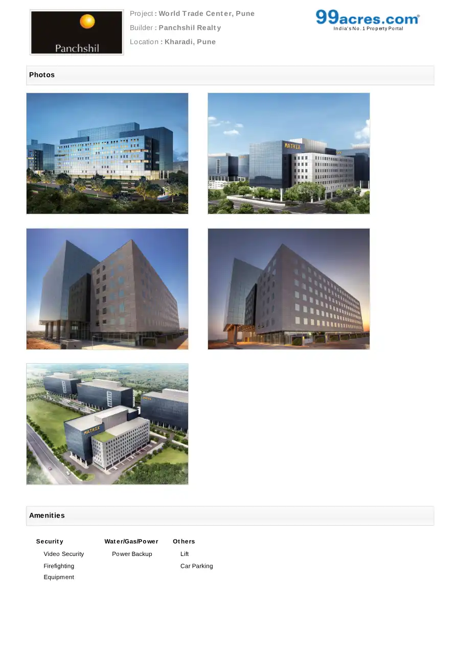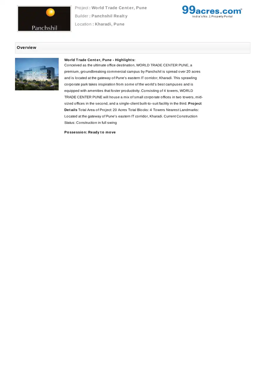 World Trade Center, Pune - Highlights: Conceived as the ultimate office destination, WORLD TRADE CENTER PUNE, a premium, groundbreaking commercial campus by Panchshil is spread over 20 acres and is located at the gateway of Pune's eastern IT corridor...