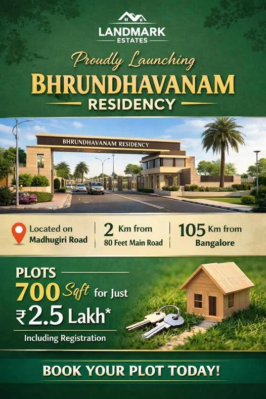Plots are available for sale at Bhrundhavanam Residency on Madhugiri Road, just 2 KM from the 80 Ft Main Road and 105 KM from Bangalore. Each plot is 700 Sq.ft and the price is ₹2....