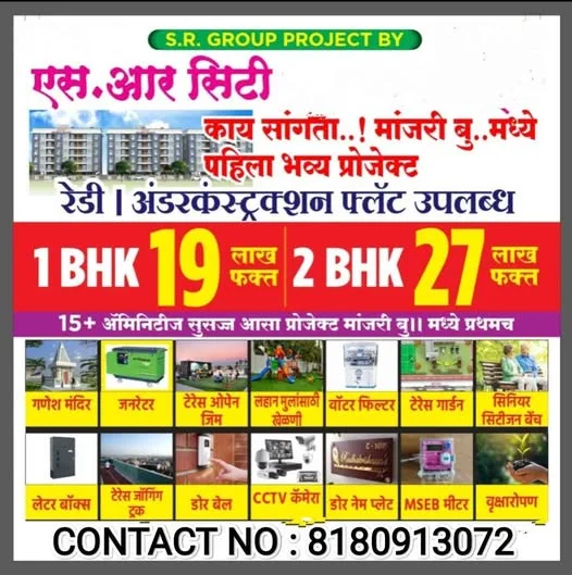 This advertisement promotes SR Group’s KRISHNAI HEIGHTS, located in Manjari, Pune, offering 1 and 2 BHK flats with festive pricing and special booking offers. The homes are describ...