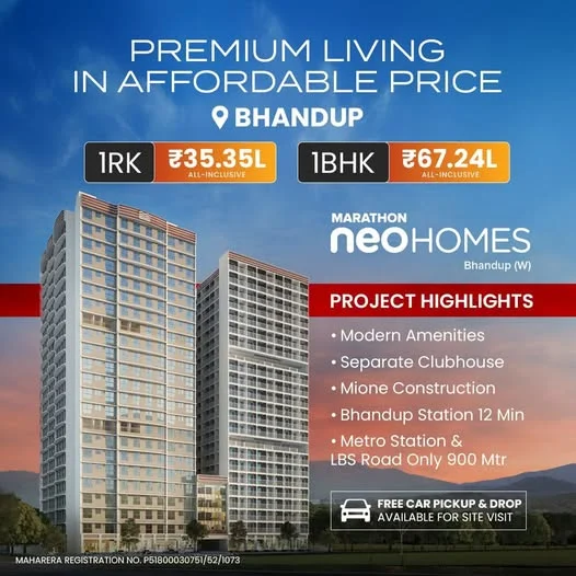 Home Star Realty presents Marathon NeoHomes, offering premium, affordable 1RK and 1BHK smart homes in Bhandup West, Mumbai. Prices start at ₹35.35 Lakhs. The project is near LBS Ro...