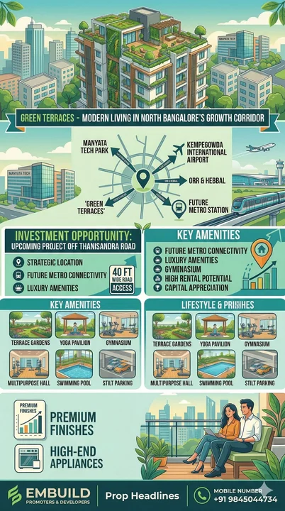 Green Terraces, a new project by Embuild Promoters & Developers, is located off Thanisandra Road in Hegde Nagar, North Bangalore. The project offers 3 BHK apartments with 2100 sqft...