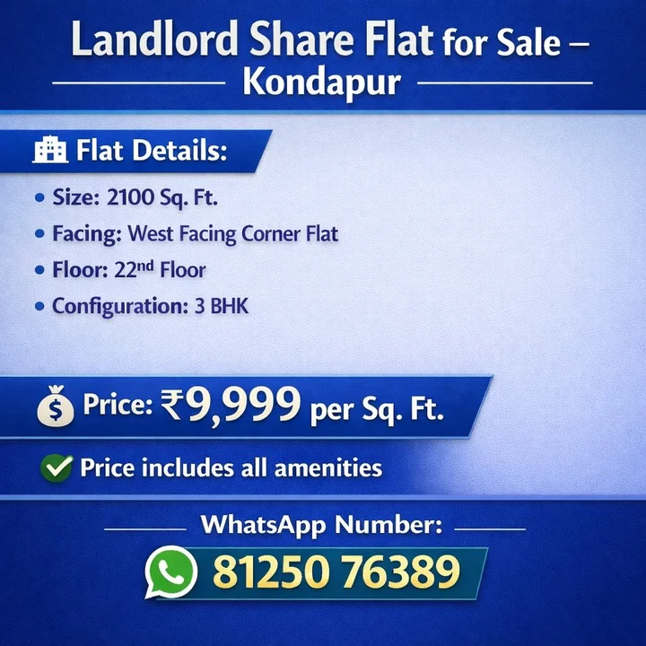 This is a listing for a 3 BHK flat for sale in Kondapur. The flat is located on the 22nd floor of the building and is west-facing. The size of the flat is 2100 sq. ft. The price is...