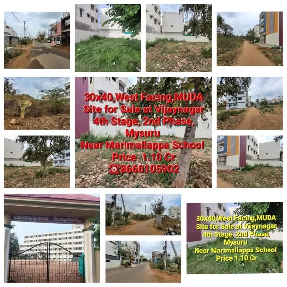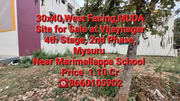This is a MUDA site for sale in Vijaynagar 4th Stage, 2nd Phase, Mysuru. The site is west facing and measures 30x40. The asking price is 1.10 Cr. The site is located near Marimalla...