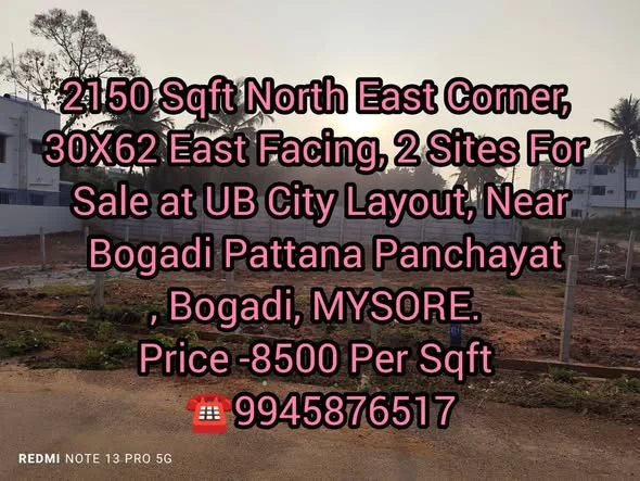 Two northeast corner sites are available for sale in UB City Layout, near Bogadi Pattana Panchayat, Bogadi, Mysore. The east-facing sites measure 30X62, totaling 2150 sqft. The pri...