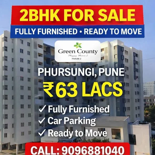 This is a 2BHK fully furnished flat for sale in Green County Phase 2, located in Phursungi near Hadapsar. The flat has a carpet area of 650 sq ft and is ready to move in. It comes ...