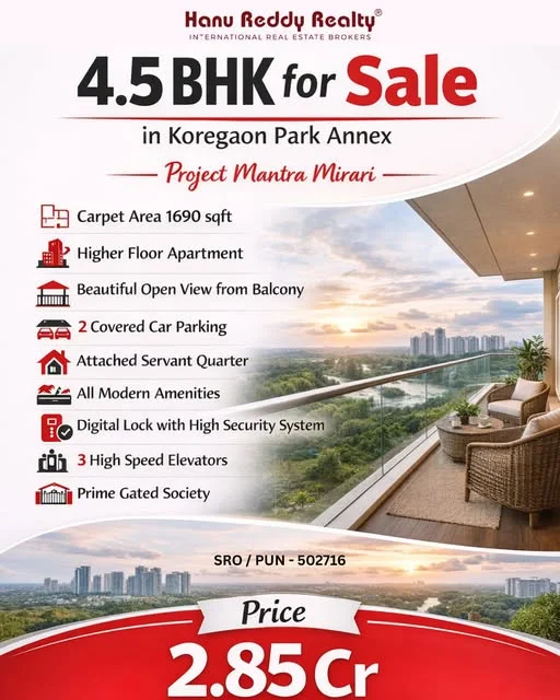 A brand new 4.5 BHK resale flat with a servant room is available for sale in Koregaon Park Annex, within the Mantra Mirari project. The apartment features a carpet area of 1690 sqf...