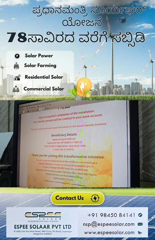 This advertisement promotes ESPEE SOLAAR PVT LTD, offering solar power solutions for residential and commercial properties in Bangalore, Karnataka. They provide high-quality solar ...