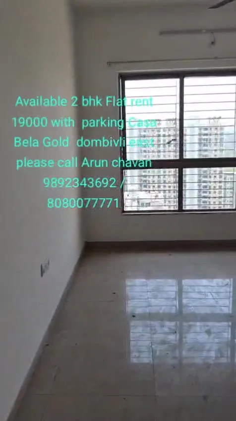 A 2 BHK flat is available for rent at Casa Bela Gold in Dombivli East. The monthly rent is ₹19,000, and parking is included. Contact Arun Chavan at 9892343692 or 8080077771 for mor...