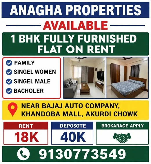 This is a fully furnished 1 BHK flat available for rent in Akurdi, near Bajaj Auto Company and Khandoba Mall. It is suitable for families, single women, single men, and bachelors. ...