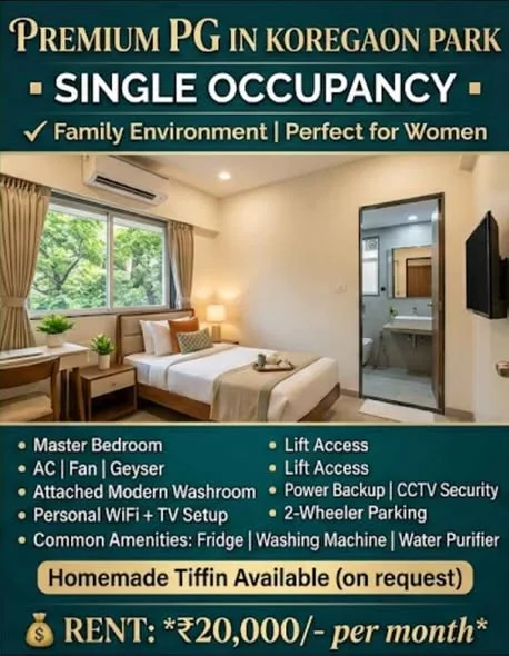 A fully furnished 1 bed, 1 bath flat is available for single occupancy in Koregaon Park. The monthly rent is ₹20,000, with a deposit of 2 to 3 months' rent required. No visitors ar...