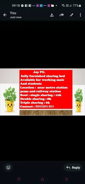 This listing advertises fully furnished sharing bed accommodations for working males and bachelor boys. The location is near Sadhu Vasvani Garden, Shagun Chowk, Deluxe Chowk, Pimpr...