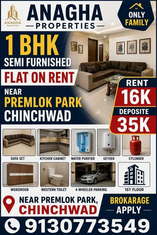 This is a 1 BHK semi-furnished flat for rent in Chinchwad, near Premlok Park. It is located on the 1st floor and includes a comfortable sofa set, modular kitchen cabinet, water pur...