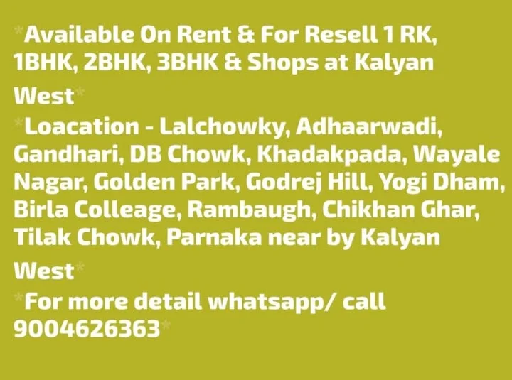 Available for rent and resale are 1 RK, 1BHK, 2BHK, 3BHK flats and shops in Kalyan West. The locations include Lalchowky, Adhaarwadi, Gandhari, DB Chowk, Khadakpada, Wayale Nagar, ...