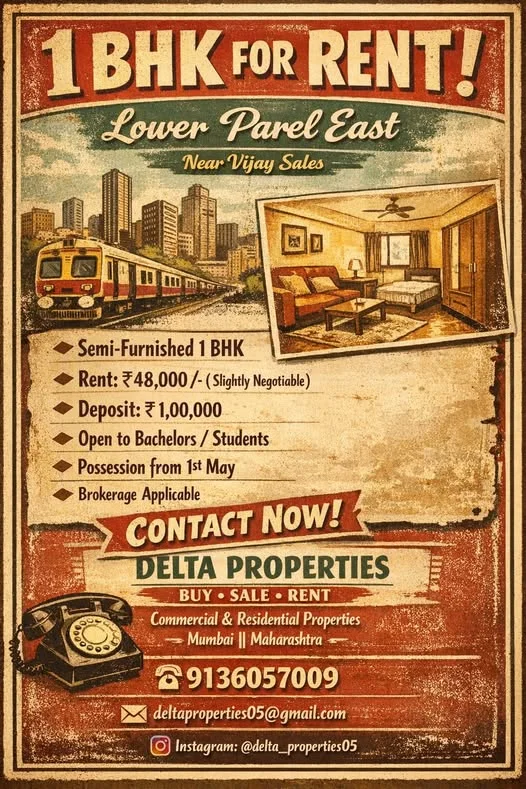 This is a 1 BHK semi-furnished flat available for rent in Lower Parel East, near Vijay Sales. It is open to bachelors (both working professionals and students). The rent is ₹48,000...