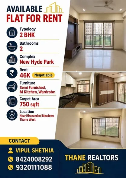 This is a 2 beds 2 bath Flat for rent in Thane, MH with a rent of ₹47,000. Please call 8424008292 for more details.