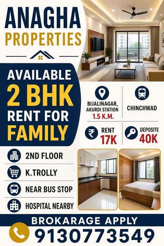 This is a 2 BHK flat for rent in Bijalinagar, near Akurdi Station (1.5 KM) in Chinchwad. The flat is located on the 2nd floor in a safe and quiet location. It is suitable for famil...