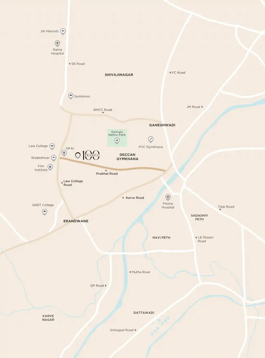 Deccan Gymkhana is a prime and well-established locality situated in the heart of Pune, Maharashtra. It is known for its central position, connecting various key areas of the city. The area is bordered by important roads and is in close proximity to educational hubs and commercial centers, making it a highly sought-after address for residents and businesses alike.