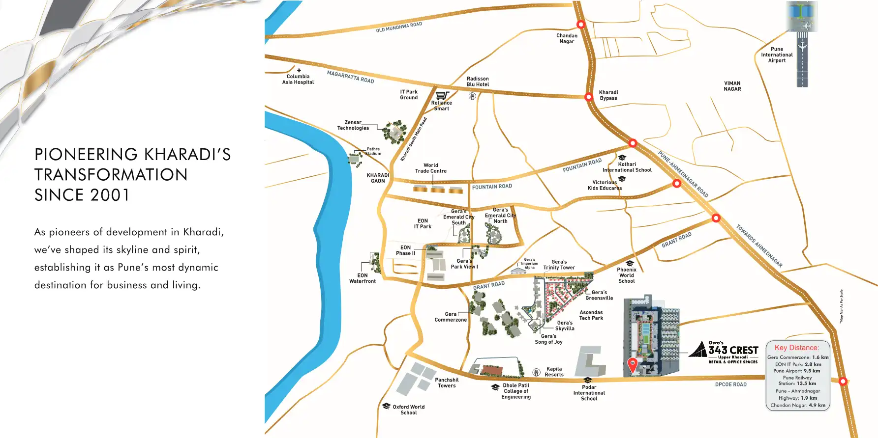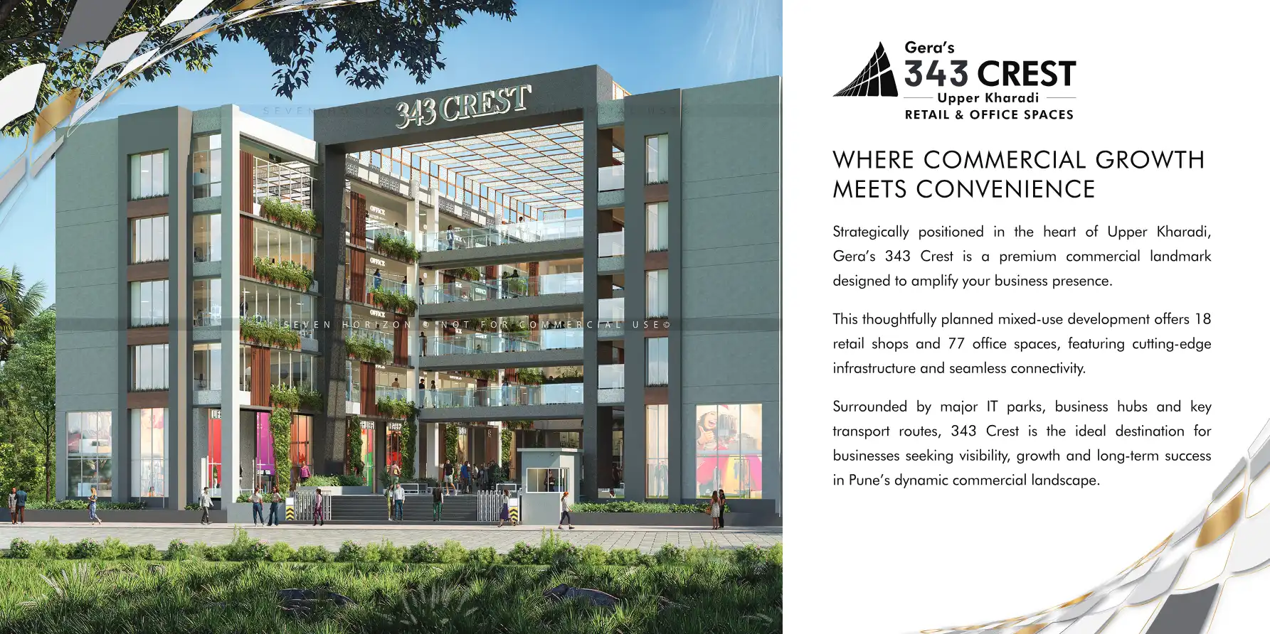 Strategically positioned in the heart of Upper Kharadi, Gera's 343 Crest is a premium commercial landmark designed to amplify your business presence. This thoughtfully planned mixed-use development offers 18 retail shops and 77 office spaces, featuri...