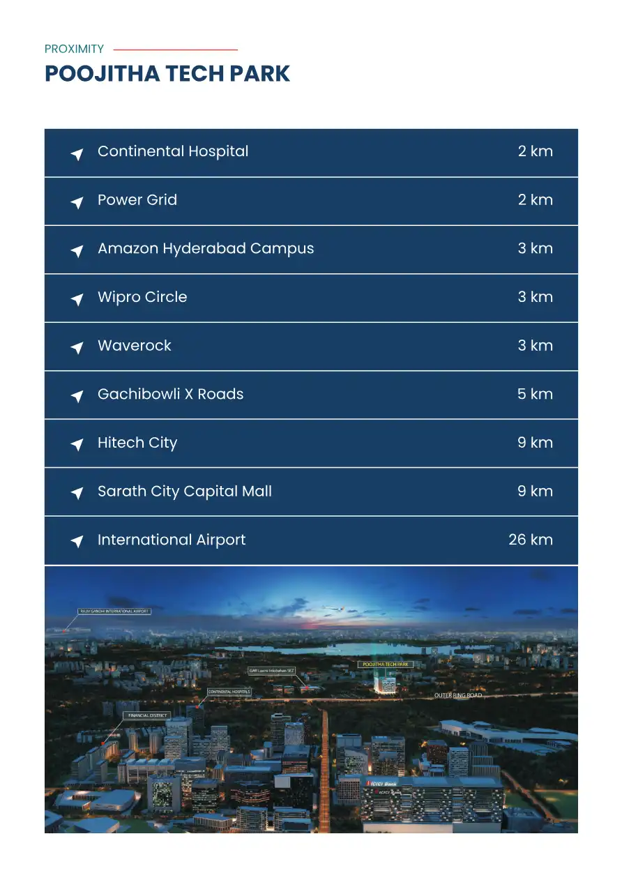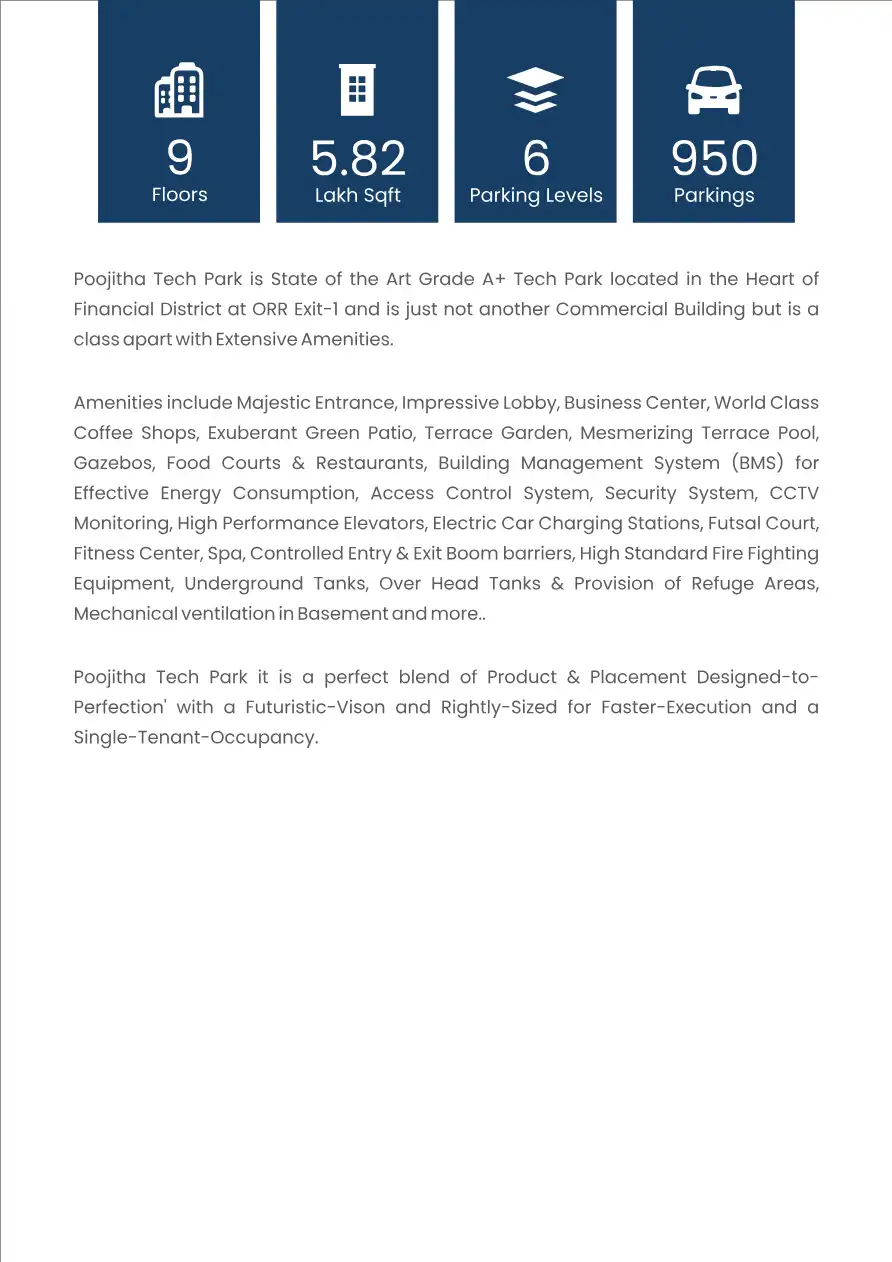 Poojitha Tech Park is State of the Art Grade A+ Tech Park located in the Heart of Financial District at ORR Exit-1 and is just not another Commercial Building but is a class apart with Extensive Amenities. Amenities include Majestic Entrance, Impress...