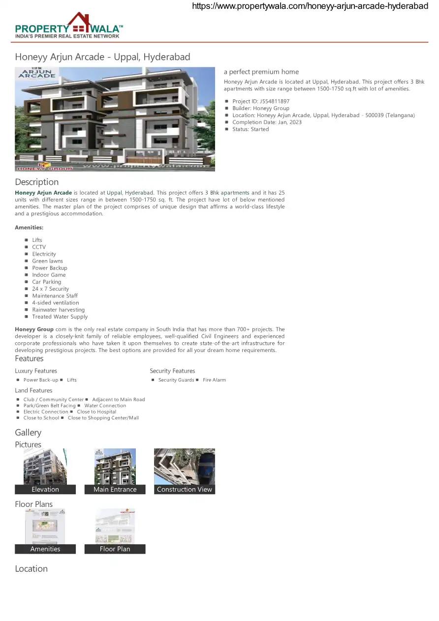 Honeyy Arjun Arcade is located at Uppal, Hyderabad. This project offers 3 Bhk apartments and it has 25 units with different sizes range in between 1500-1750 sq. ft. The project have lot of below mentioned amenities. The master plan of the project com...