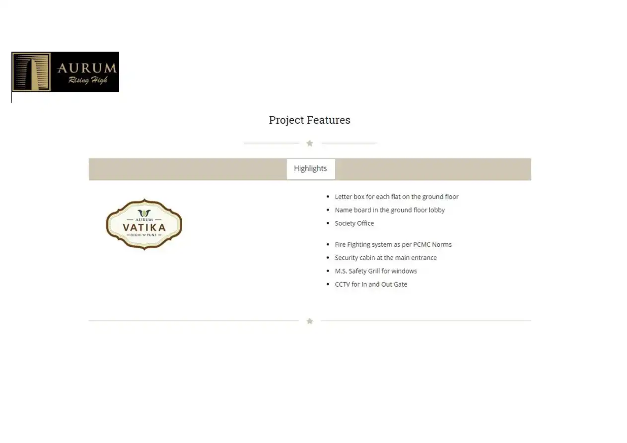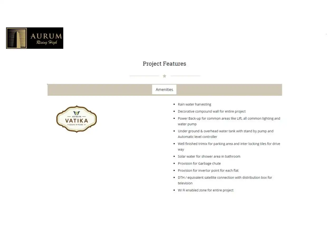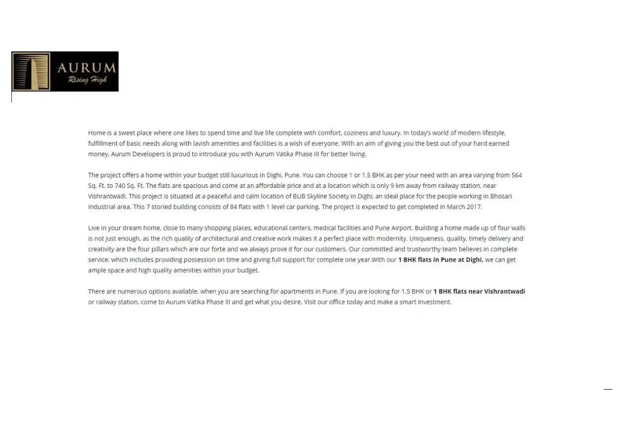 Aurum Vatika Phase III offers 1 and 1.5 BHK flats in Dighi, Pune. It is located near Vishrantwadi and is expected to be completed in March 2017.