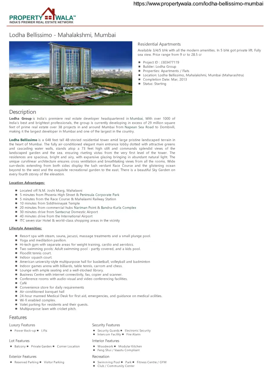 Lodha Bellissimo is a 648 feet tall 48-storied residential tower amid large pristine landscaped terrain in the heart of Mumbai. The fully air-conditioned elegant main entrance lobby dotted with attractive greens and cascading water walls, stands atop...