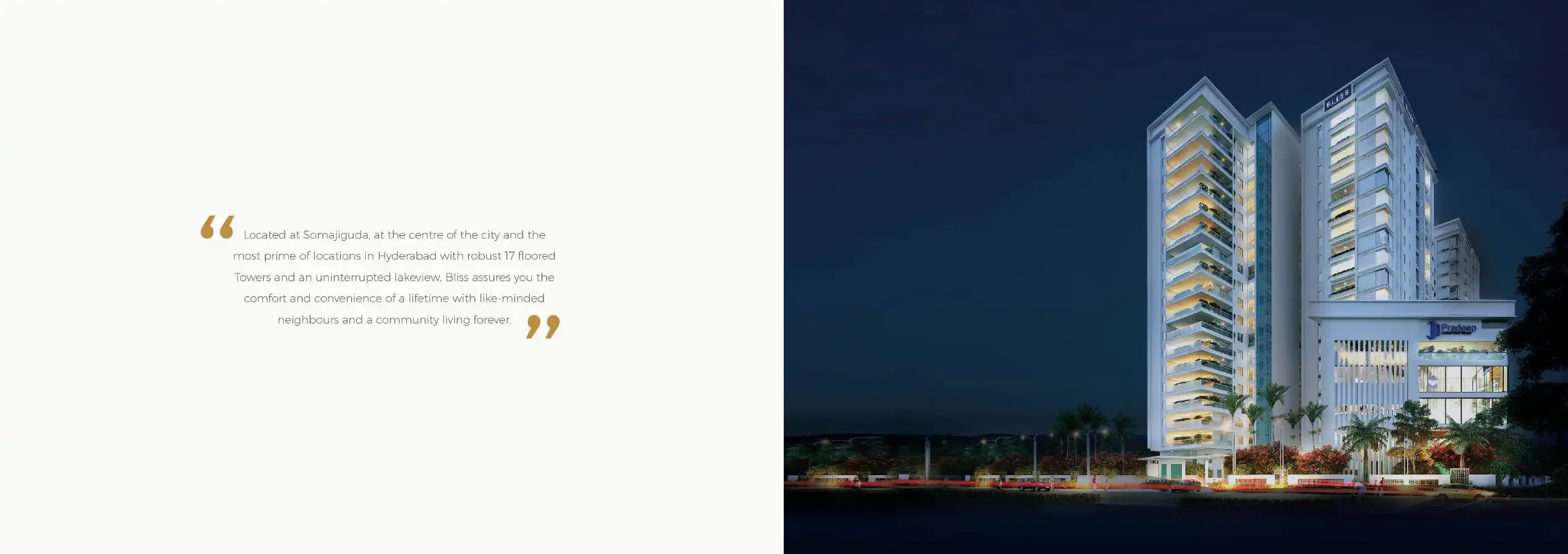 Located at Somajiguda, at the centre of the city and the most prime of locations in Hyderabad with robust 17 floored Towers and an uninterrupted lakeview, Bliss assures you the comfort and convenience of a lifetime with like-minded neighbours and a c...