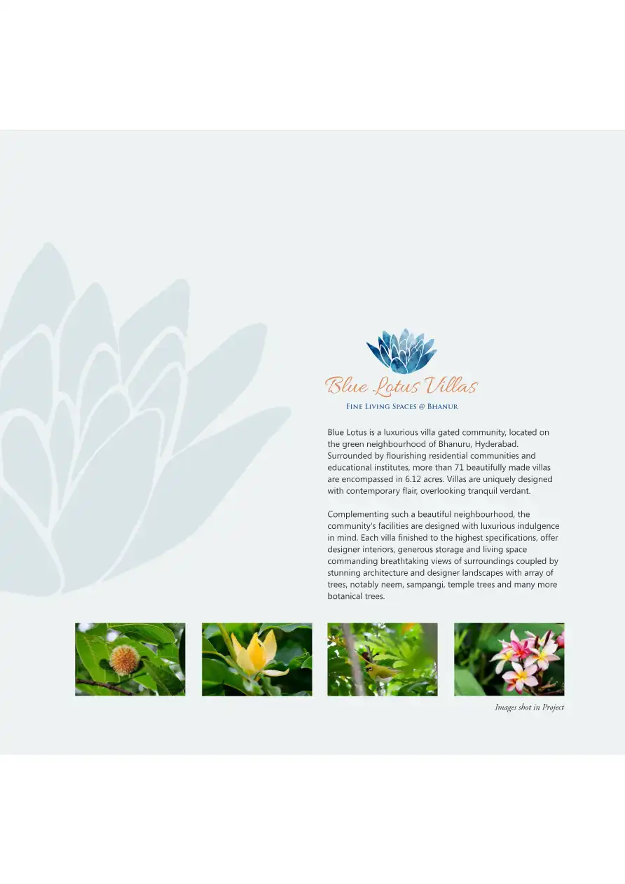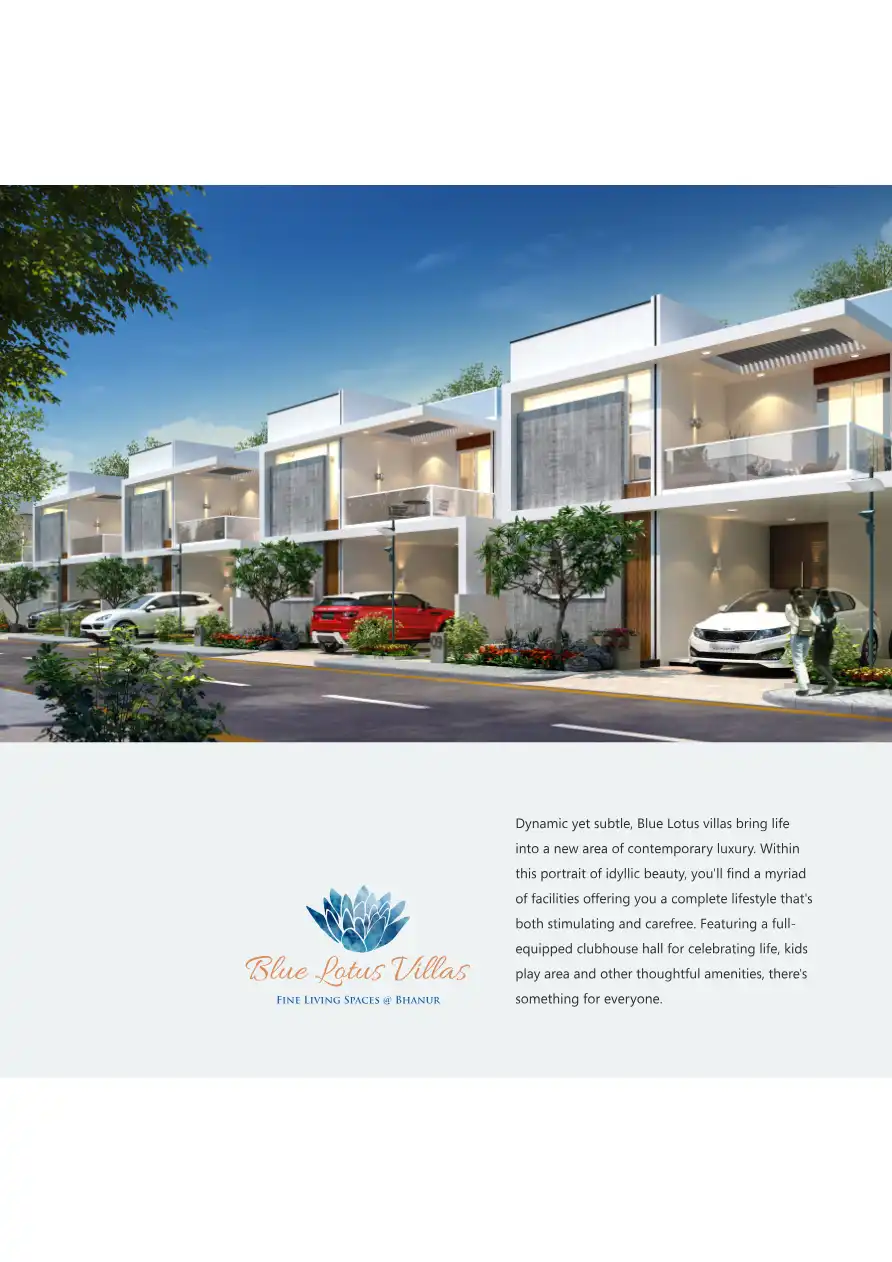 Blue Lotus is a luxurious villa gated community, located on the green neighbourhood of Bhanuru, Hyderabad. Surrounded by flourishing residential communities and educational institutes, more than 71 beautifully made villas are encompassed in 6.12 acre...