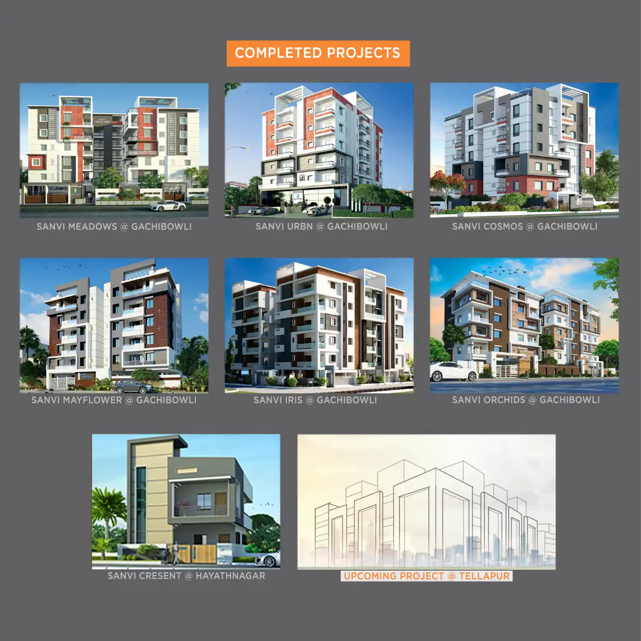 Stellar Avenue by K Raheja Corp in JV Hills, offering luxurious 3 & 4 BHK apartments, was completed in September 2022. Sivika Nigam by JSNR Constructions, providing 2 & 3 BHK apartments, was completed in 2019. Cyber Nest by JASWITHA, offering 2 & 3 BHK apartments, is expected for possession in March 2024, just 10 minutes from Gachibowli.