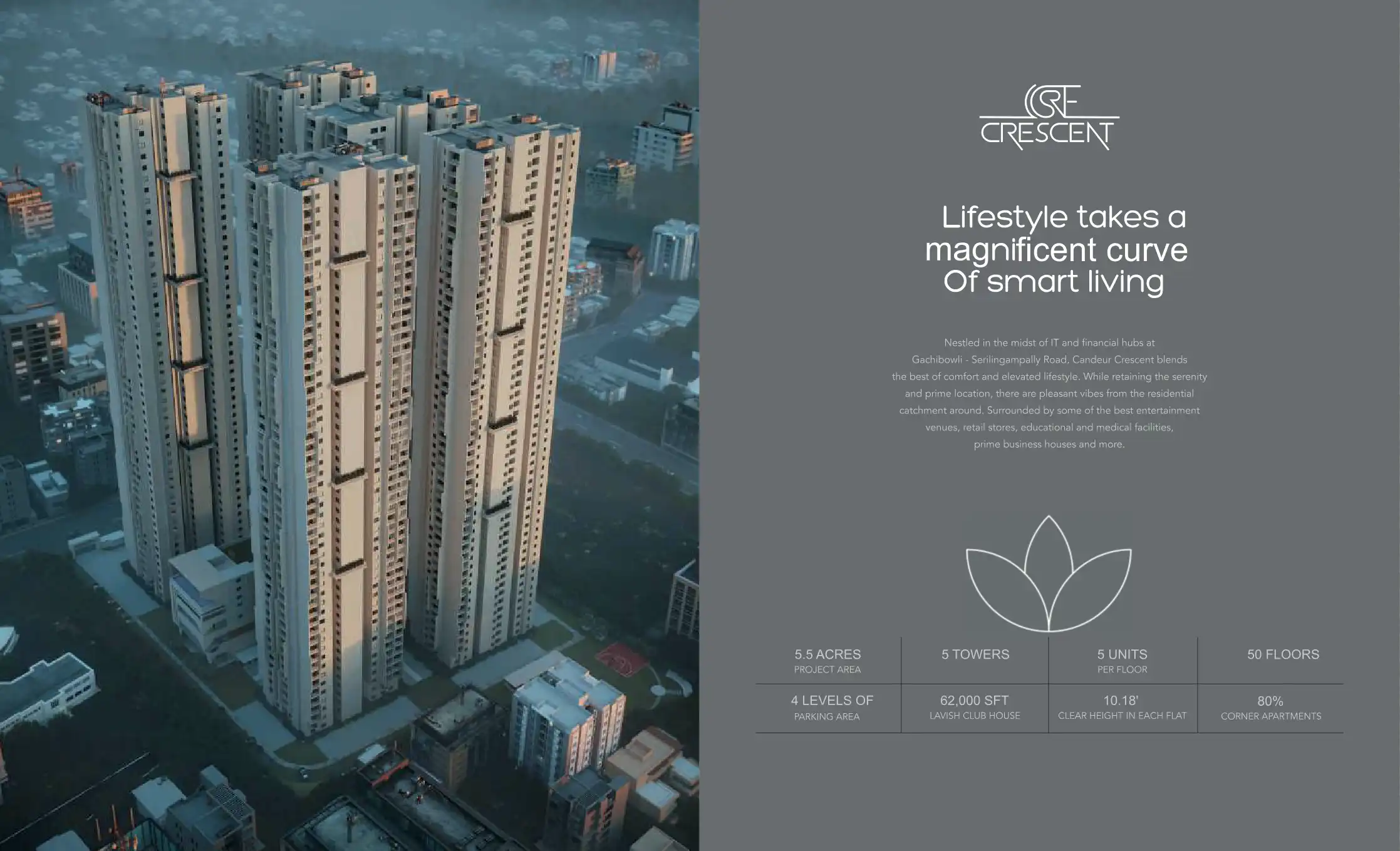 Nestled in the midst of IT and financial hubs at Gachibowli - Serilingampally Road, Candeur Crescent blends the best of comfort and elevated lifestyle. While retaining the serenity and prime location, there are pleasant vibes from the residential cat...