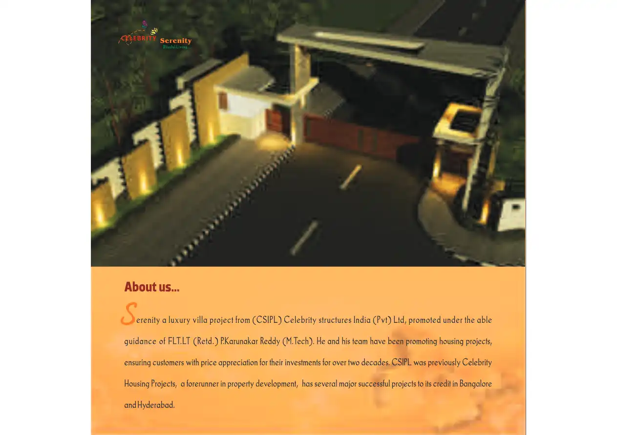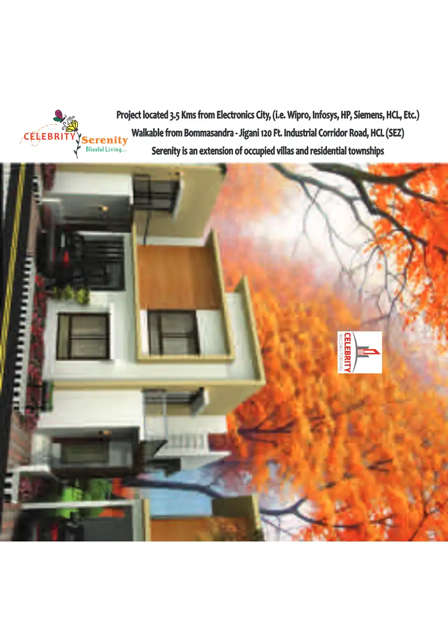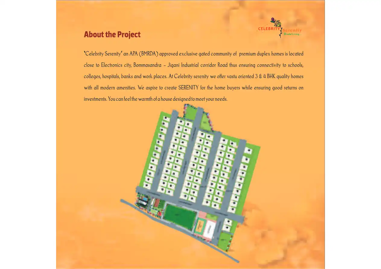 "Celebrity Serenity" an APA (BMRDA) approved exclusive gated community of premium duplex homes is located close to Electronics city, Bommasandra – Jigani Industrial corridor Road thus ensuring connectivity to schools, colleges, hospitals, banks and w...