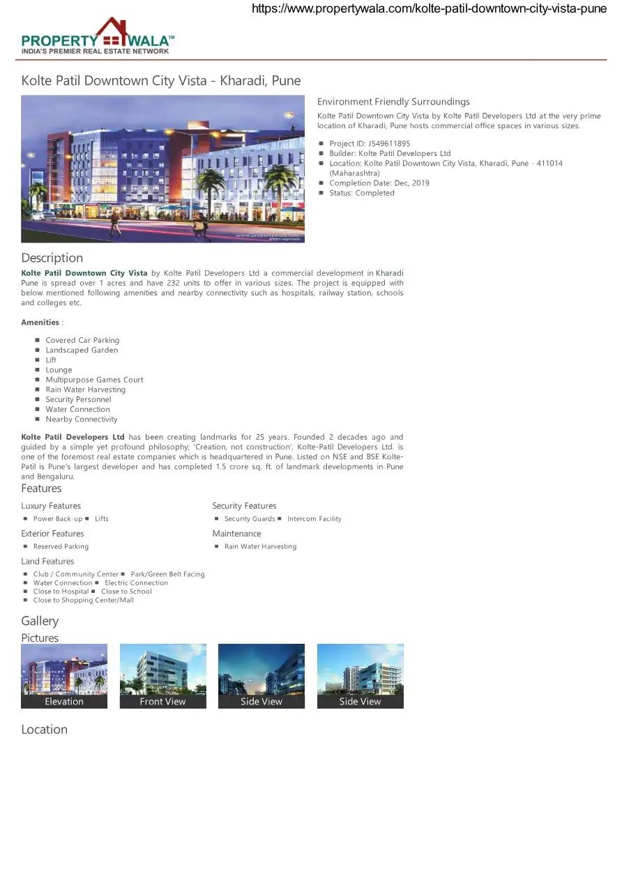 Kolte Patil Downtown City Vista by Kolte Patil Developers Ltd a commercial development in Kharadi Pune is spread over 1 acres and have 232 units to offer in various sizes. The project is equipped with below mentioned following amenities and nearby co...