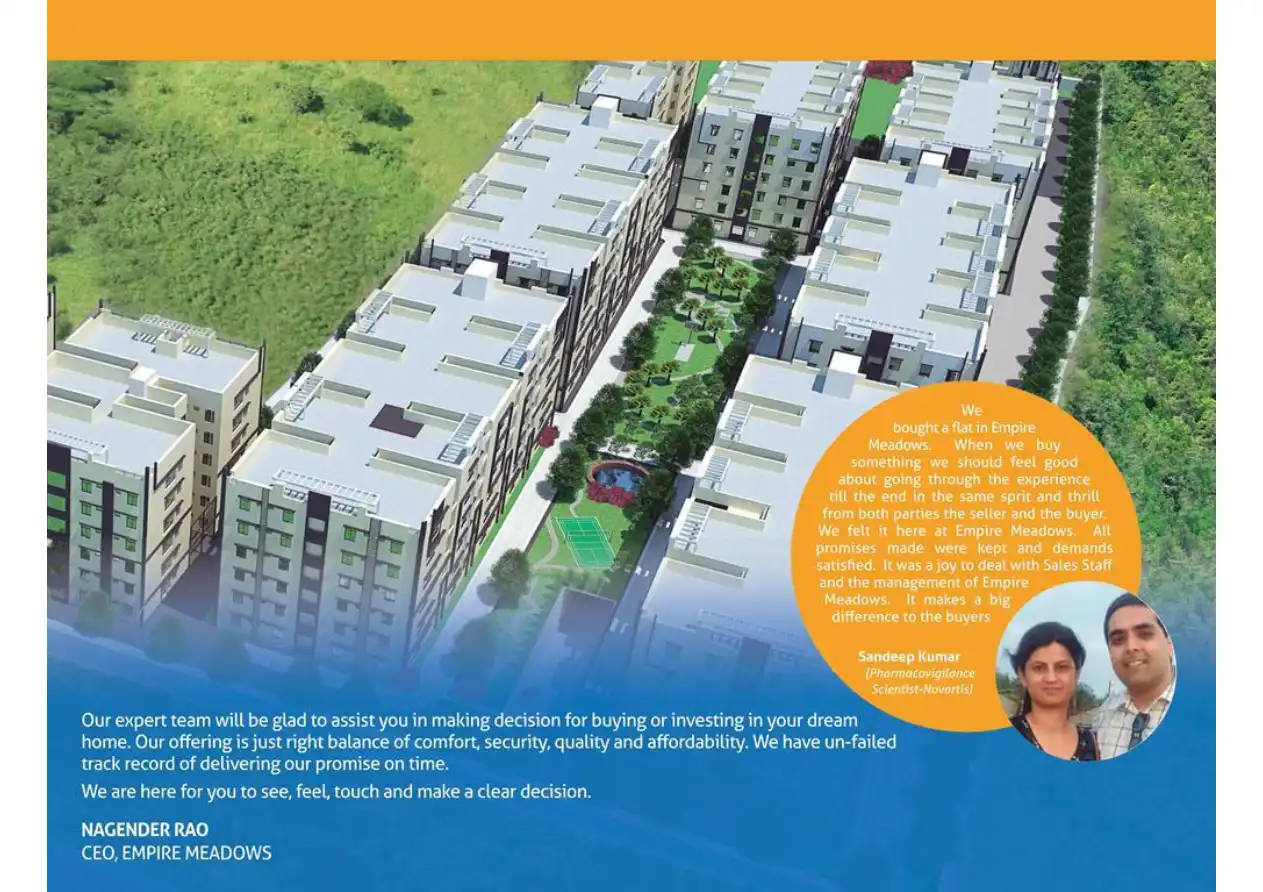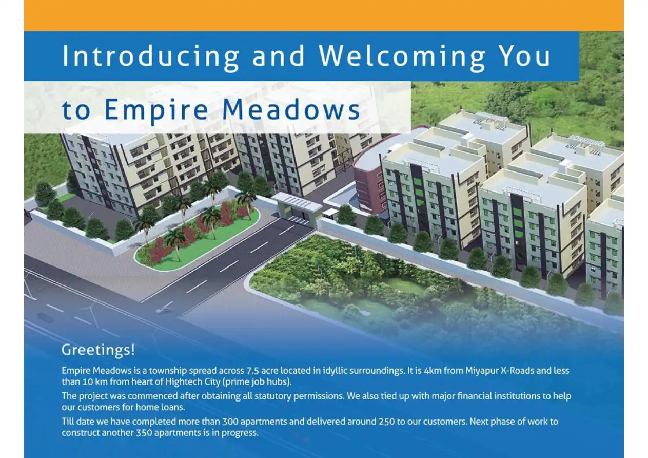 Empire Meadows is a township spread across 7.5 acre located in idyllic surroundings. It is 4km from Miyapur X-Roads and less than 10 km from heart of Hightech City (prime job hubs).