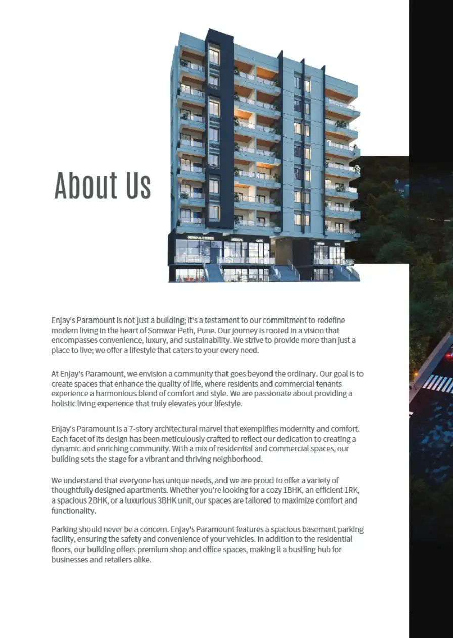 Enjay's Paramount, a creation by Enjay Infra that redefines modern living in the vibrant heart of Somwar Peth, Pune. At Enjay's Paramount, we pride ourselves on delivering not just a building but a lifestyle that caters to your every need.