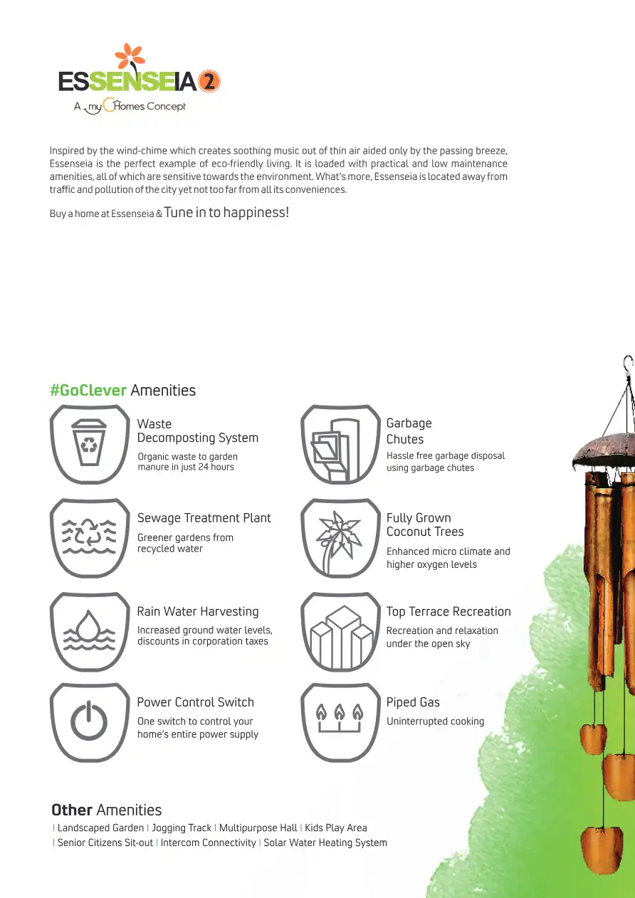 Inspired by the wind-chime which creates soothing music out of thin air aided only by the passing breeze, Essenseia is the perfect example of eco-friendly living. It is loaded with practical and low maintenance amenities, all of which are sensitive t...