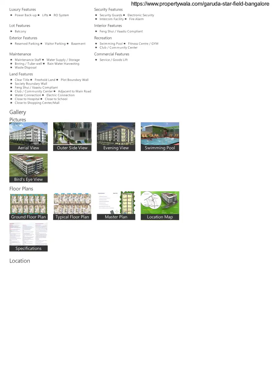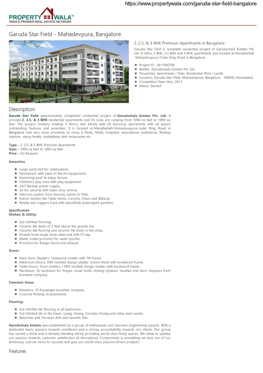 Garuda Star Field approximately completed residential project of Garudachala Estates Pvt. Ltd. It provide 2, 2.5, & 3 BHK residential apartments and it's sizes are ranging from 1094 sq feet to 1890 sq feet.