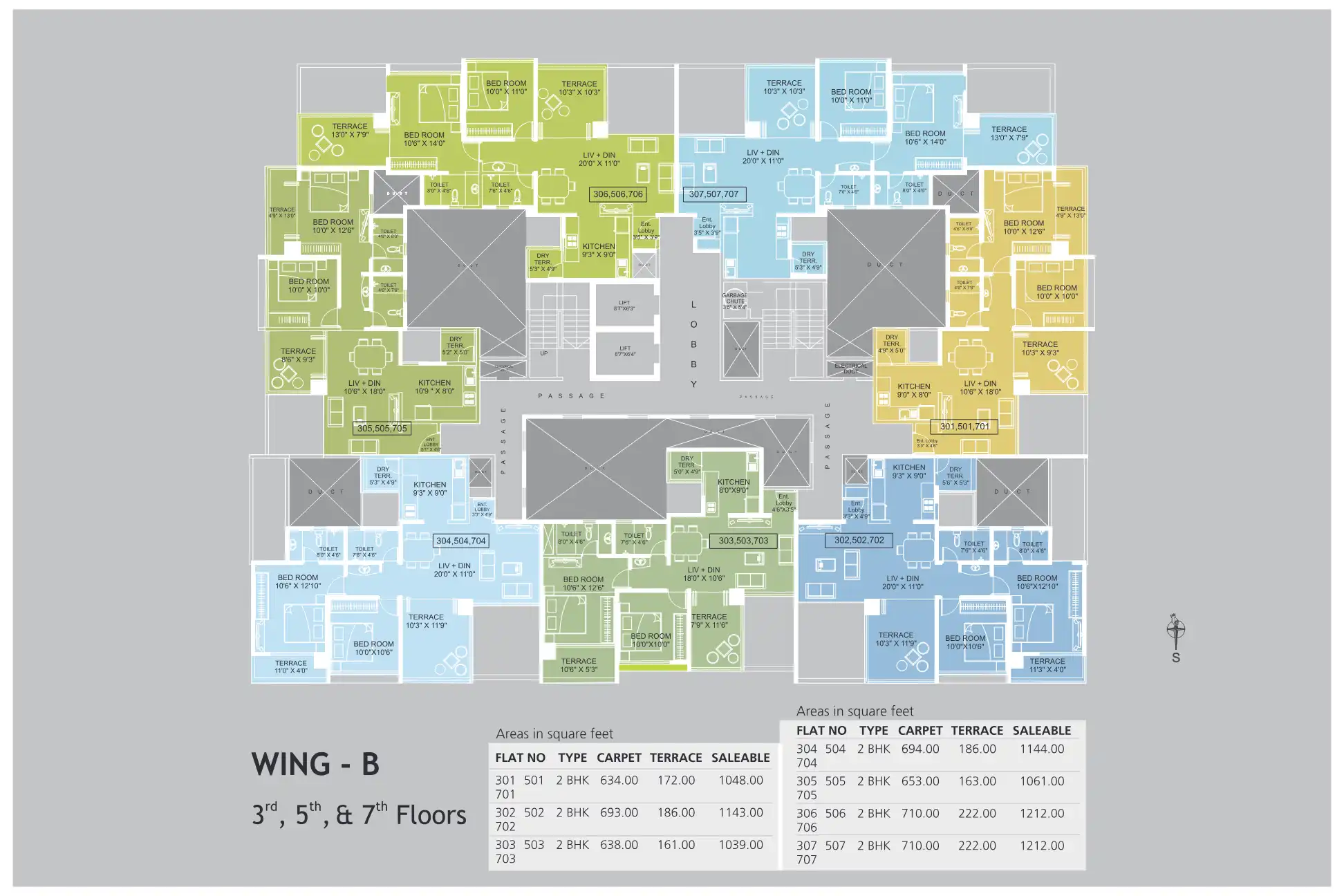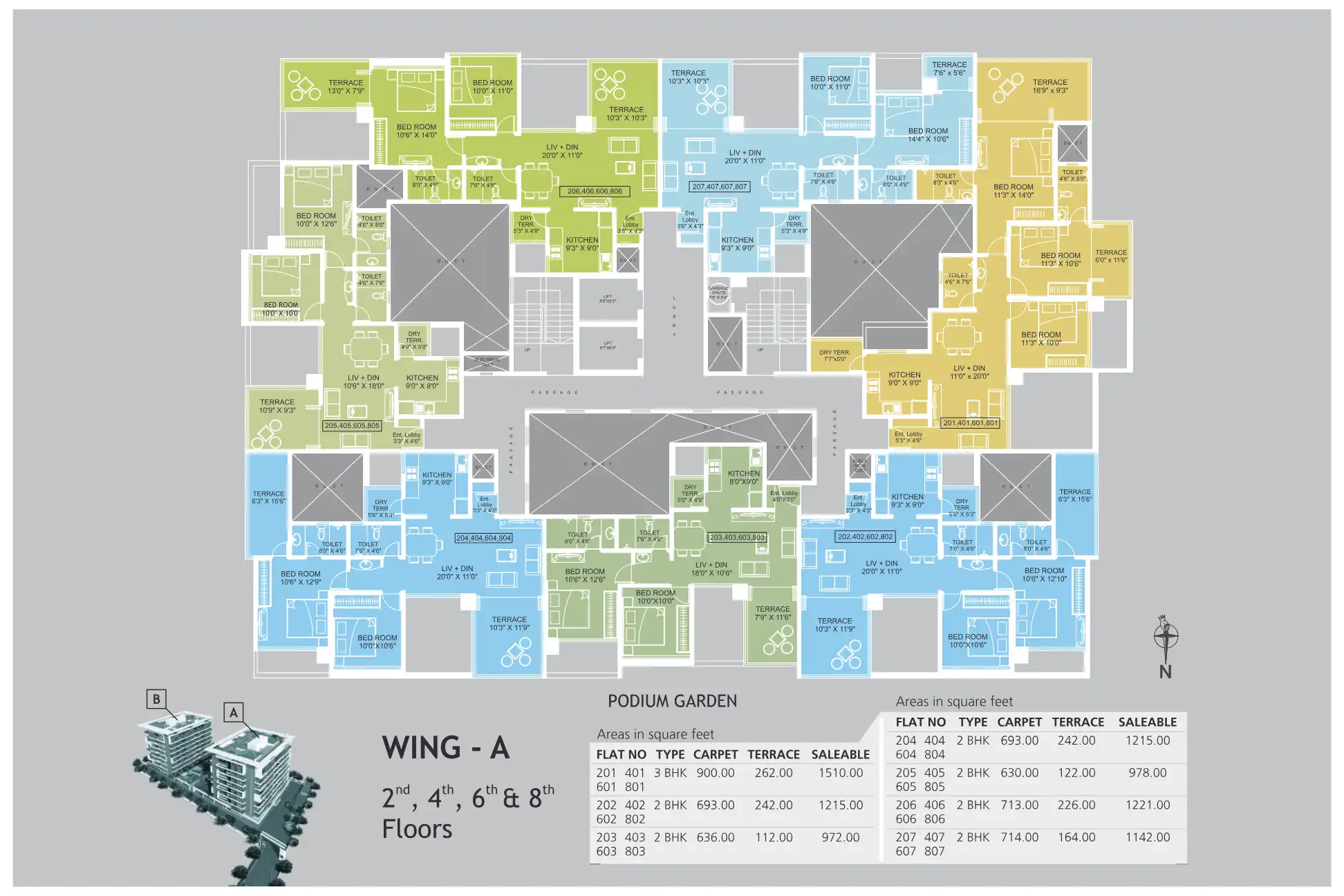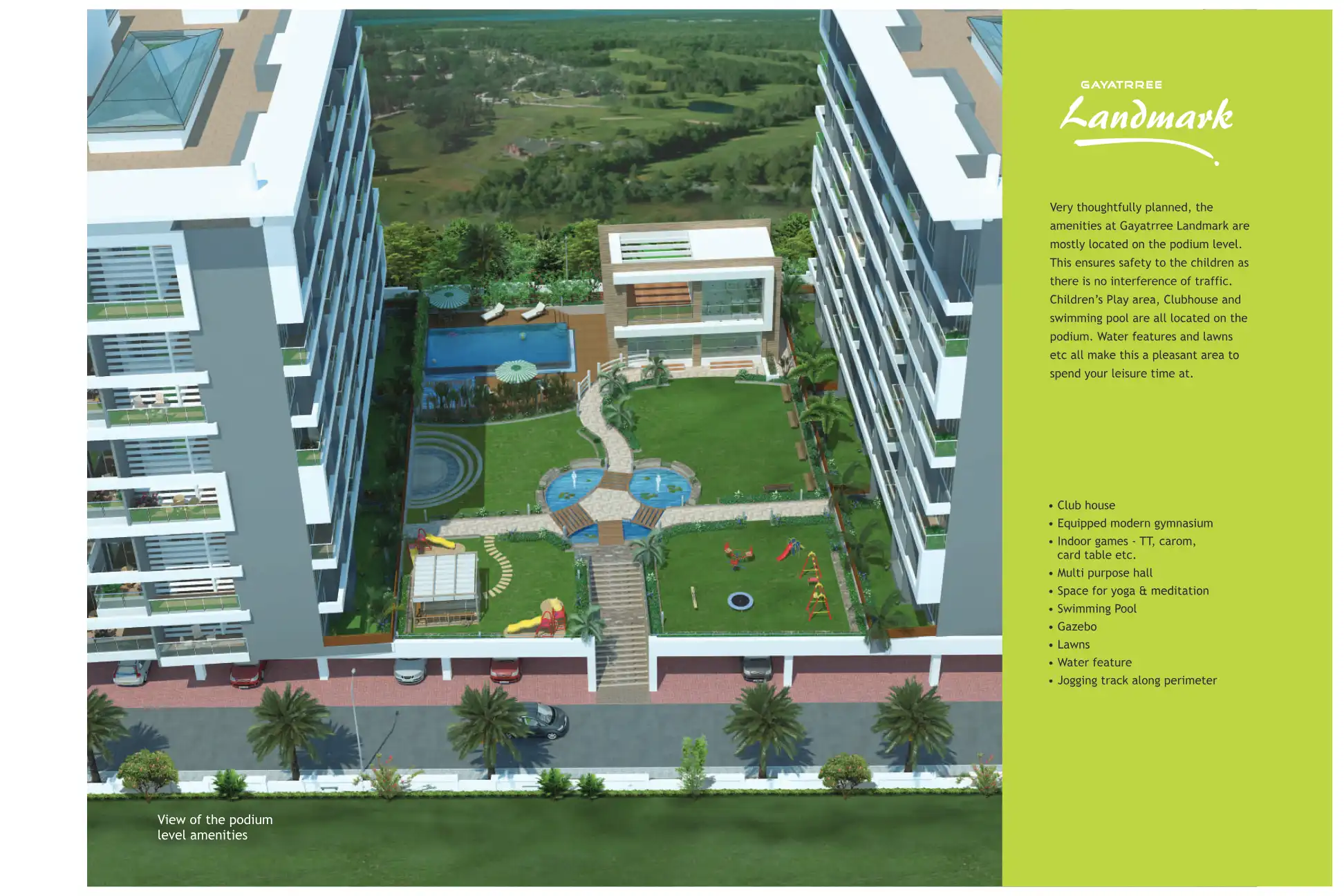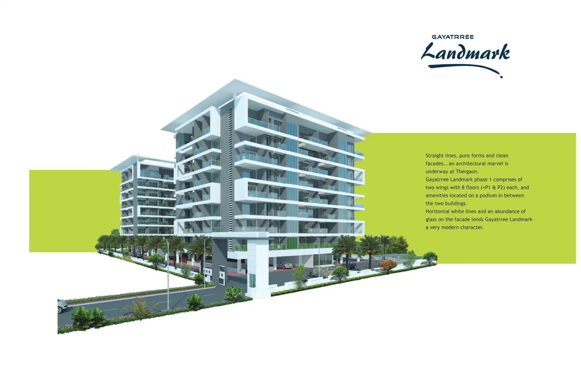 Gayatrree Landmark phase 1 comprises of two wings with 8 floors (+P1 & P2) each, and amenities located on a podium in between the two buildings.