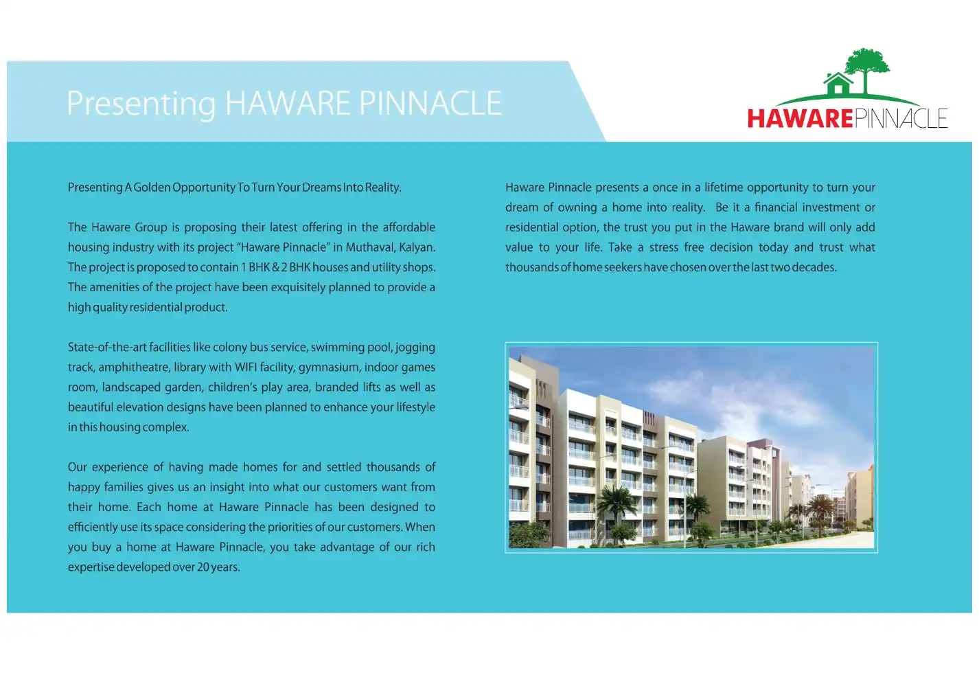 The project Haware Pinnacle has 1 & 2 BHK homes which are affordable in price but come without any compromise on quality. Although making affordable houses is our social commitment, the houses come with modern amenities like Colony Bus Service, Swimm...
