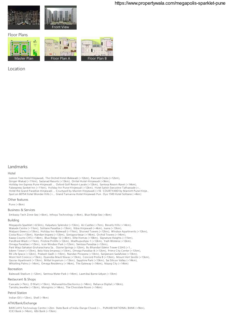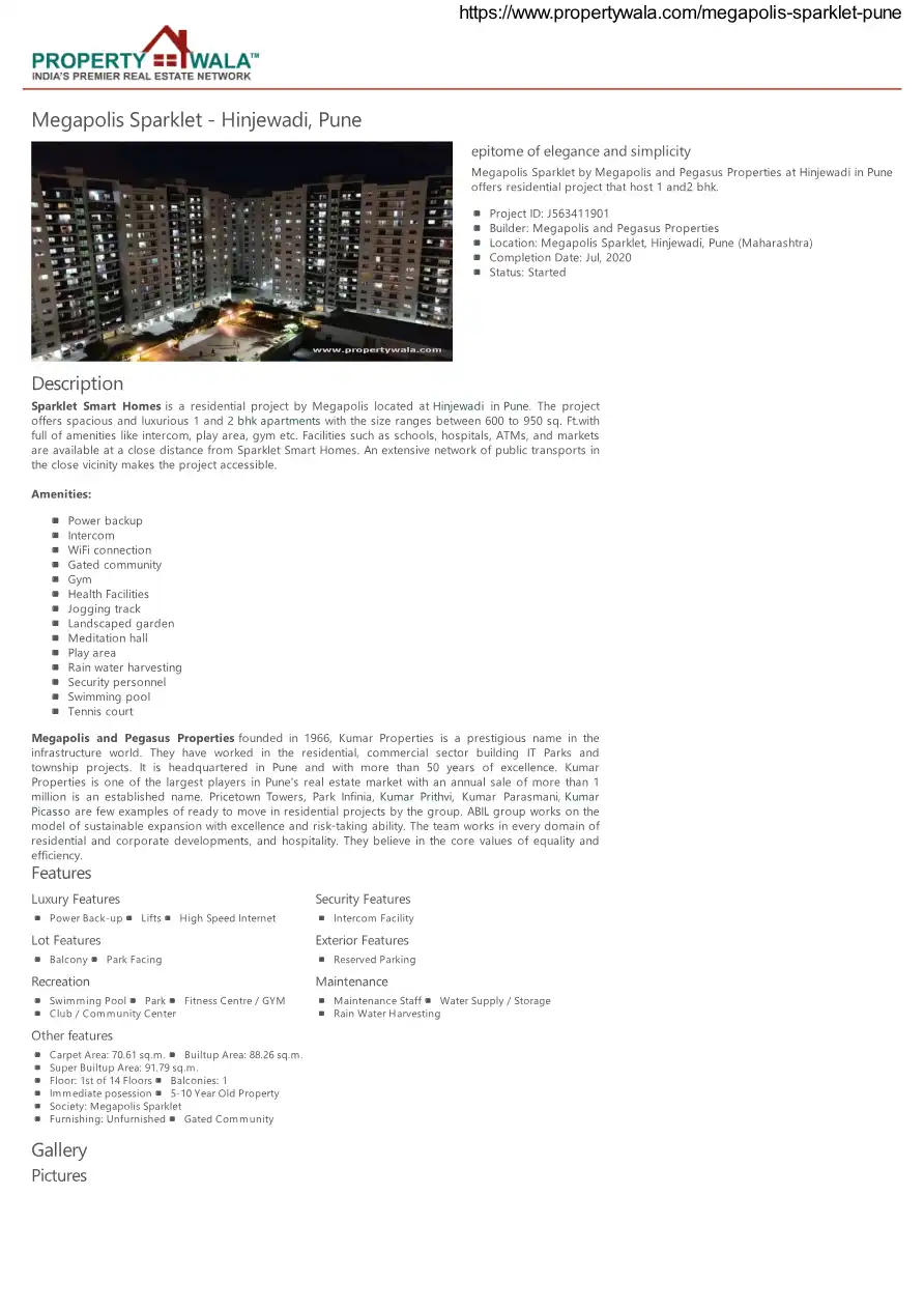 Sparklet Smart Homes is a residential project by Megapolis located at Hinjewadi in Pune. The project offers spacious and luxurious 1 and 2 bhk apartments with the size ranges between 600 to 950 sq. Ft.with full of amenities like intercom, play area, ...