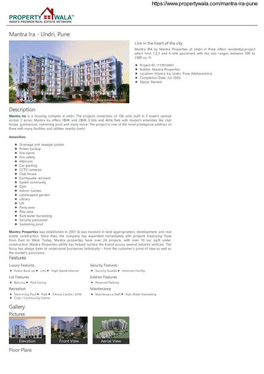 Mantra Ira is a housing complex in undri. The projects comprises of 196 units built in 3 towers spread across 2 acres. Mantra Ira offers 1BHK and 2BHK 3 bhk and 4bhk flats with modern amenities like club house, gymnasium, swimming pool and many more....