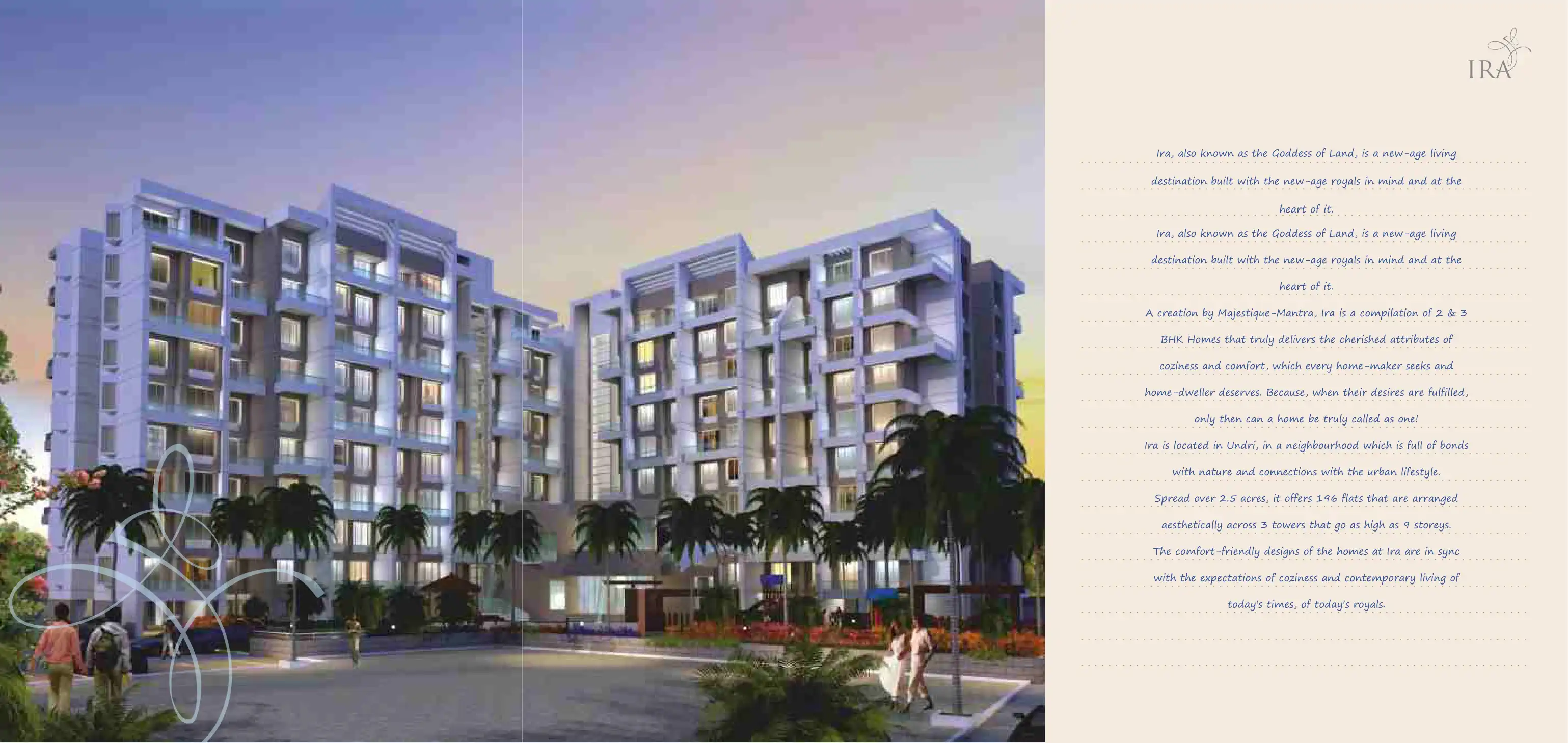 Ira is a compilation of 2 & 3 BHK Homes that truly delivers the cherished attributes of coziness and comfort, which every home-maker seeks and home-dweller deserves.