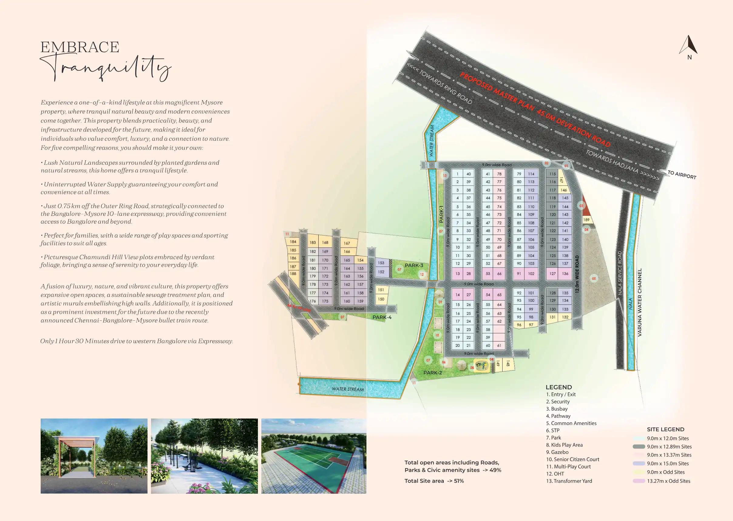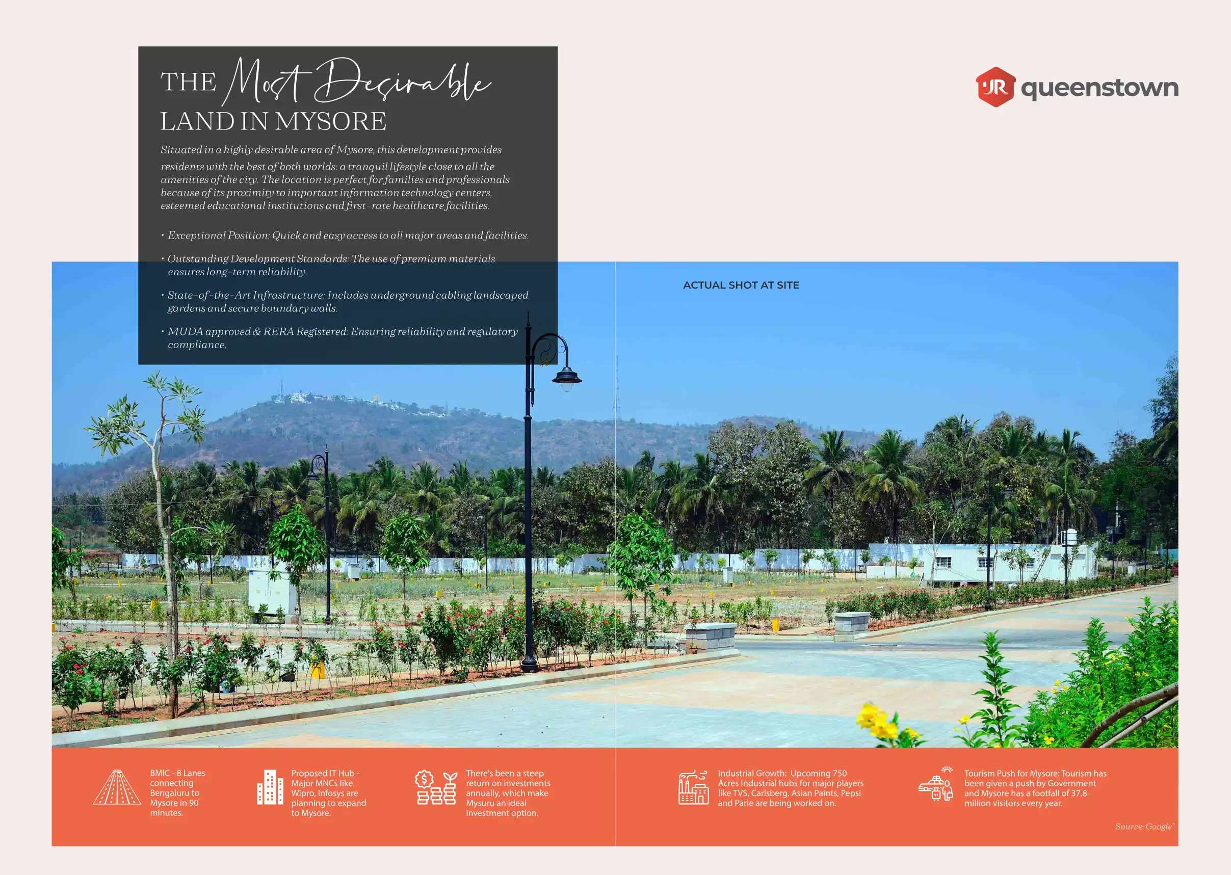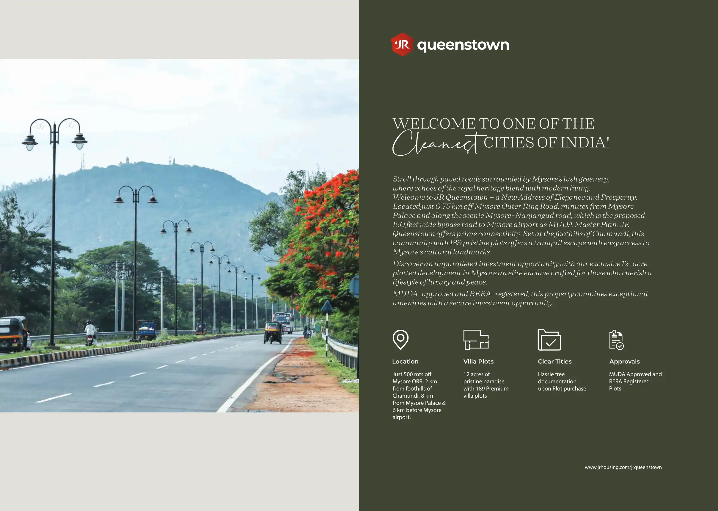 Located just 0.75 km off Mysore Outer Ring Road, minutes from Mysore Palace and along the scenic Mysore-Nanjangud road, which is the proposed 150 feet wide bypass road to Mysore airport as MUDA Master Plan, JR Queenstown offers prime connectivity.