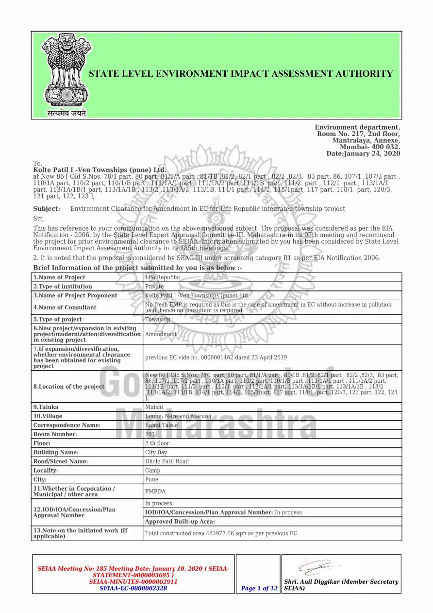 Environment Clearance for Amendment in EC for Life Republic integrated township project