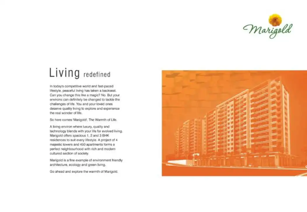 Marigold offers spacious 1, 2 and 3 BHK residences to suit every lifestyle. A project of 4 majestic towers and 450 apartments forms a perfect neighbourhood with rich and modern cultured section of society.