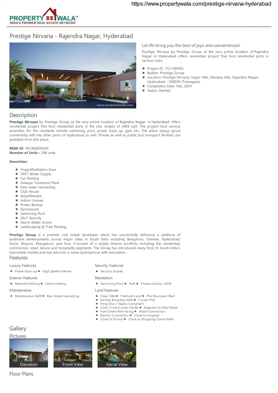 Prestige Nirvana by Prestige Group at the very prime location of Rajendra Nagar in Hyderabad offers residential project that host residential plots in the size ranges of 2403 sqft. The project host various amenities for the residents include swimming...